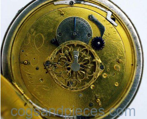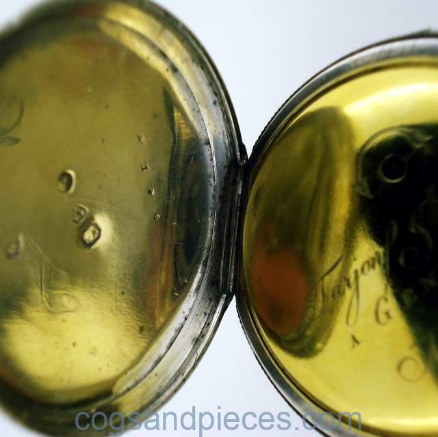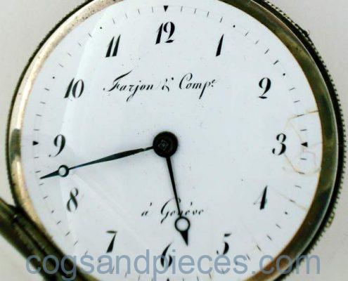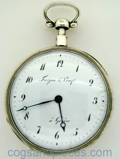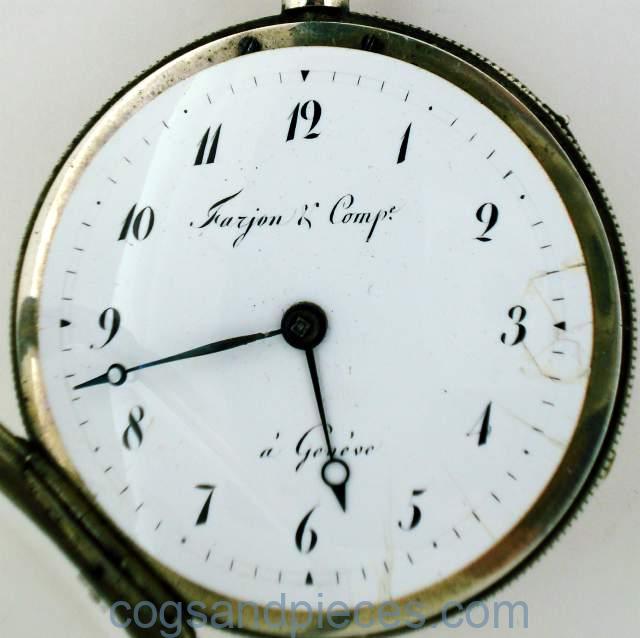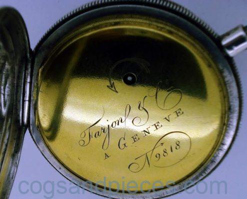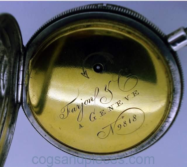 CASE : The large silver case is about 59mm in diameter. The inner gilded brass dustcap is signed Farjon & Ce. A GENEVE, and numbered 9818. The inside of the silver dustcap has Swiss silver hallmarks. All catches and hinges are fine. The case is in fine condition no damage, excessive wear or repairs.