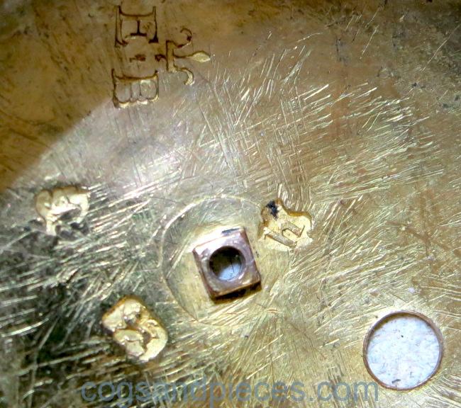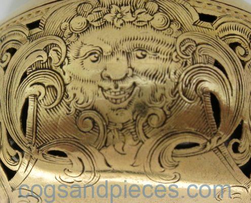 INNER CASE : 22ct. gold, with clear London hallmarks under the bell (1743, maker EB). Beautifully engraved throughout, with the serial number (488) engraved near the stem. A few bruises on the back and around the stem but generally in good condition with no repairs. The hinge, bow, bell and high dome bull’s eye crystal are all in fine condition and the case snaps shut correctly.