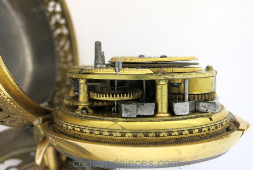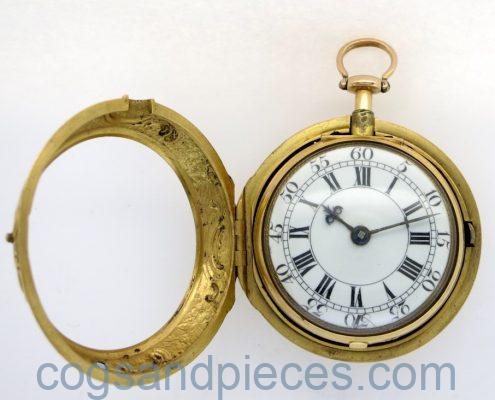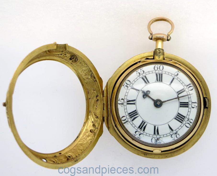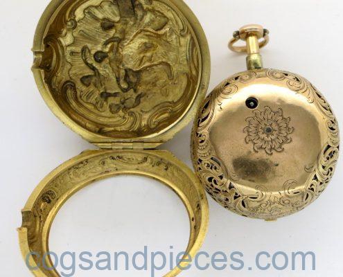This is a wonderful quality mid 18th century London verge, in gold repousse pair cases.
