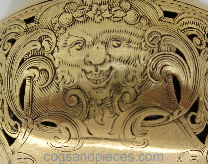 OUTER CASE : A good 22ct. gold pair case, with wonderful repousse work (showing Europa with Zeus in the form of a bull). A few repairs to the high points of the repousse work where they have been worn down (lighter colour). The catch button shows a split but the hinge and catch are fine and the bezel snaps shut nicely. There are 2 small round holes in the bezel, near the catch (not sure of their purpose).