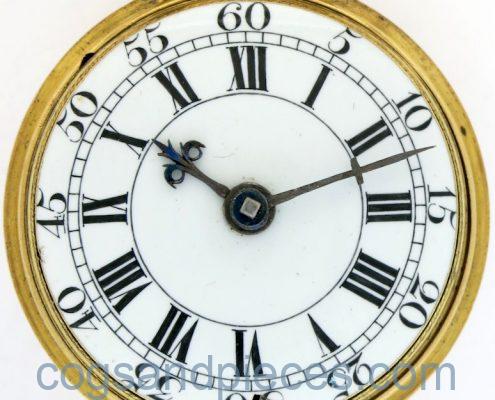 DIAL : Fine white enamel in very good condition with just a short hairline at the catch at 6, and a tiny chip on the edge at 9. Blued steel beetle and poker hands (the hour appears to be an original mid 18th century hand, but the minute is a later replacement).