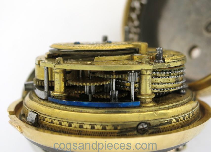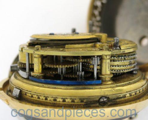 The watch movement is in good original condition and running well, but the repeating movement has some parts missing under the dial (see photos) so is not working. The repeating parts between the plates appear to be complete and in good order (barrel, hammers, wheels etc.)