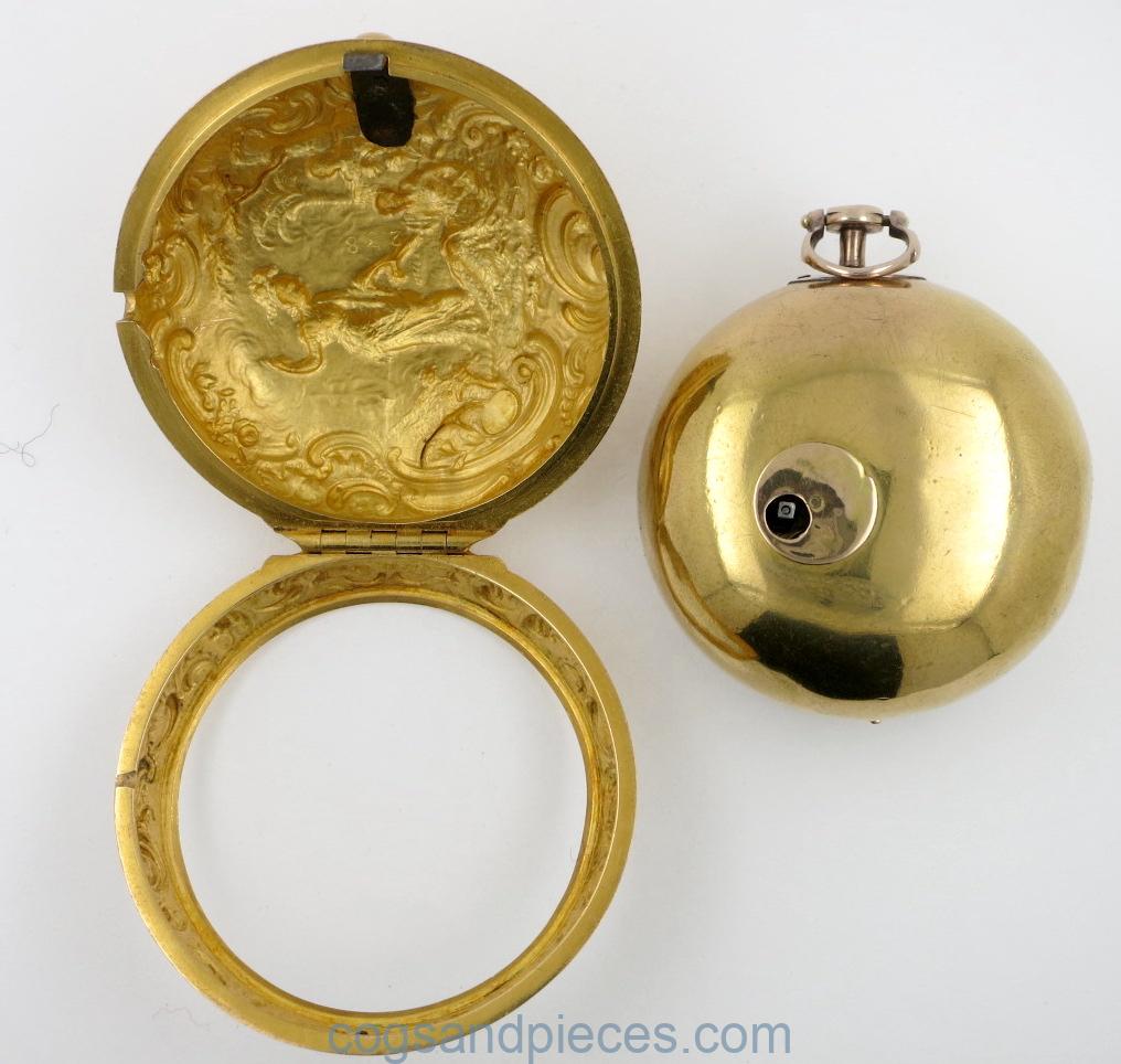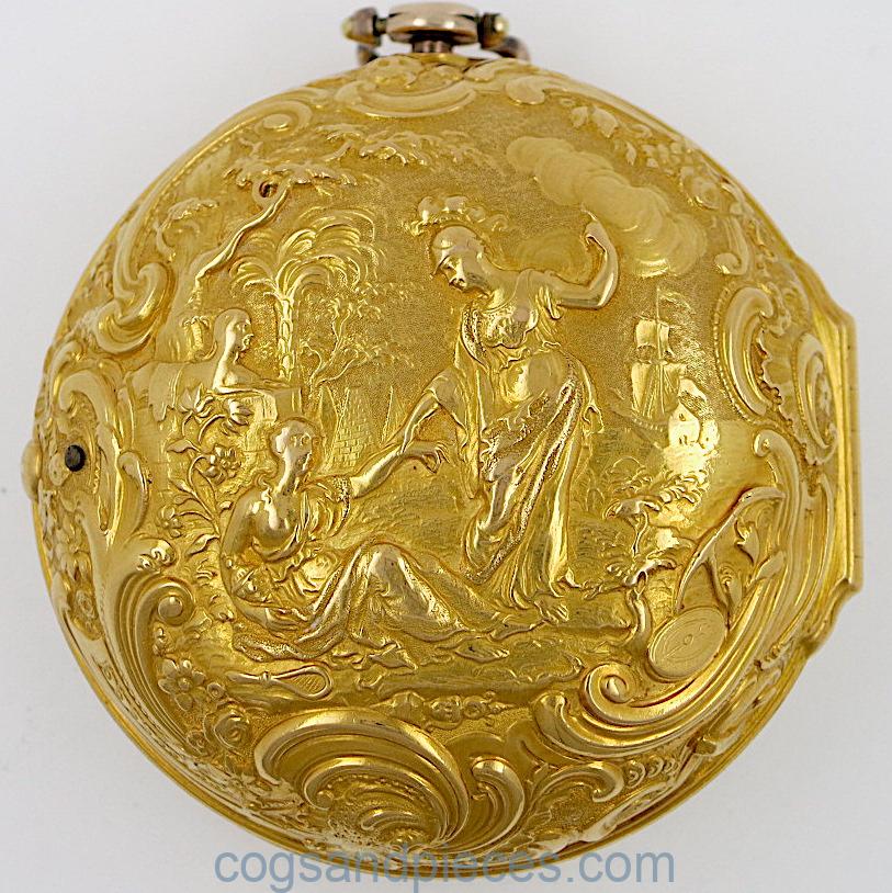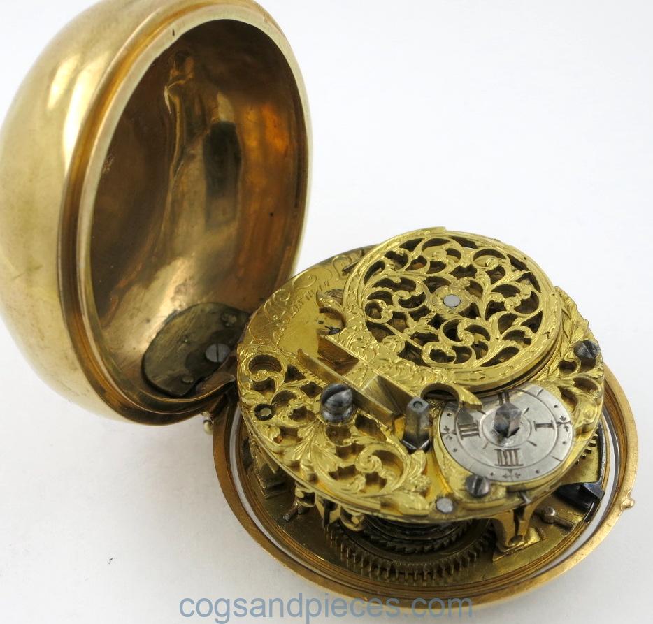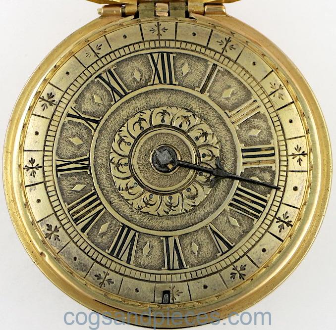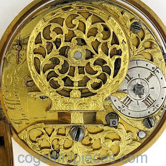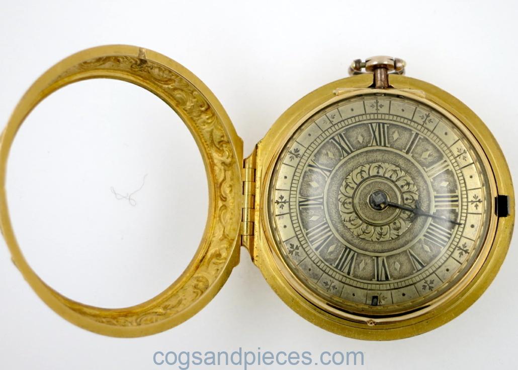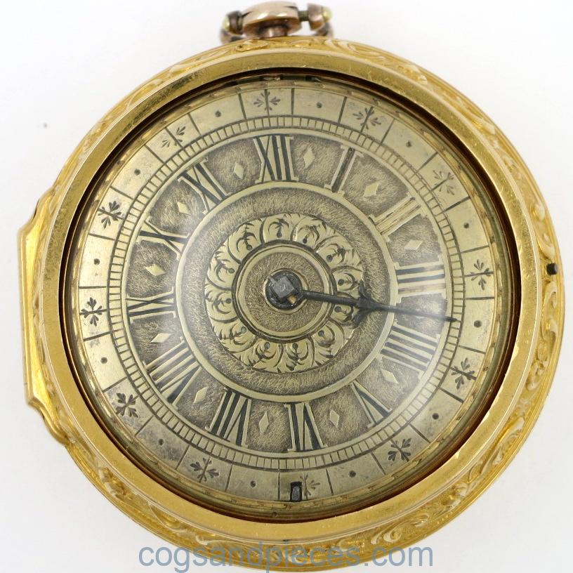 A very rare late 17thc. single handed verge, in slightly later gold repousse pair cases.
