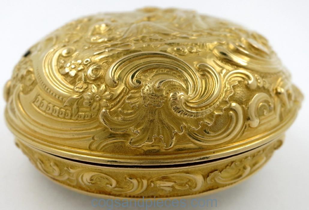 OUTER CASE : A particularly fine, gold (tested) repousse pair case, decorated with a Classical scene showing two female figures, and a Sphinx, pyramids and ship in the background.