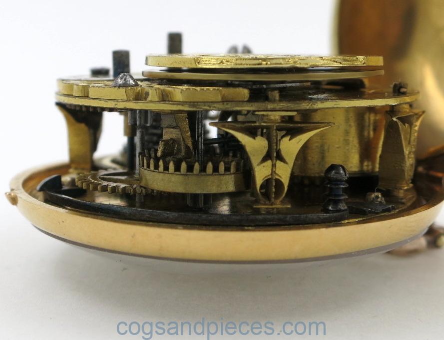 This watch has an original single handed movement, with no centre wheel and the single hand driven by a small wheel under the dial which is attached to the fusee arbor.