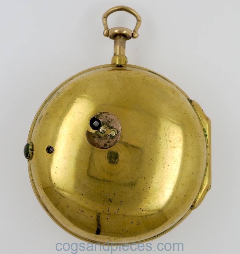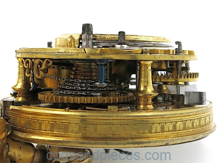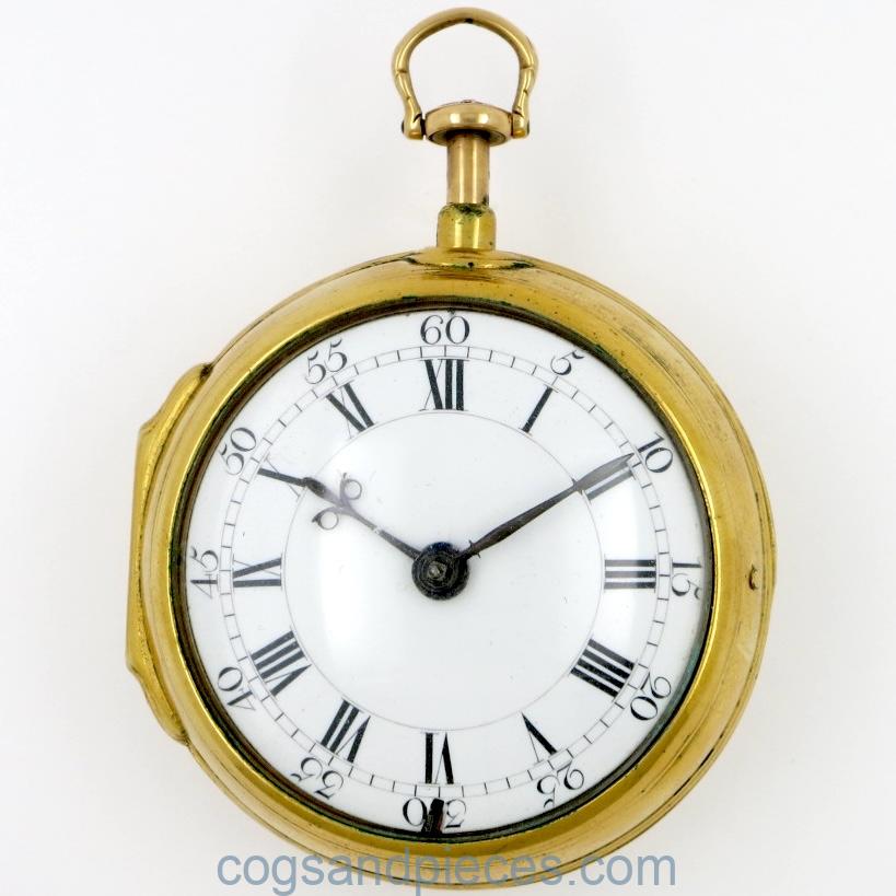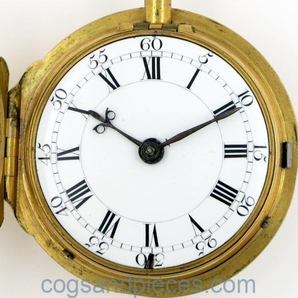 This is a large dumb repeating watch, with a verge escapement, in a gilt case. It is by a well known and prestigious London maker and is in unusually good condition.