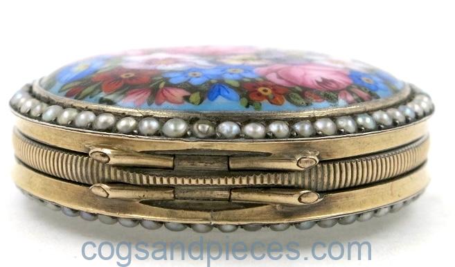 The back of the case is set with a beautifully painted floral enamel plaque. The enamel is in very good condition, with just a few very light surface scratches but no chips or repairs.