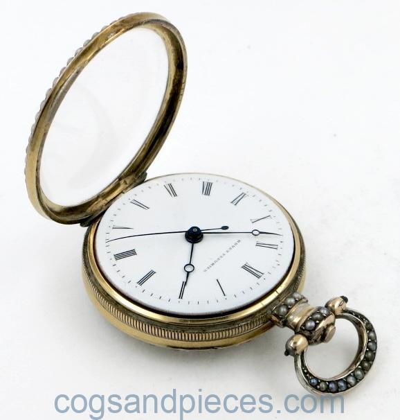 The front bezel, back border, stem and bow are all set with tiny seed pearls. These are complete, with none missing.