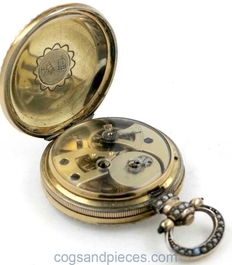 CASE : This is a wonderful case in pearl set silver gilt and enamel. Engraved on the inside back with a signature in Chinese characters.
