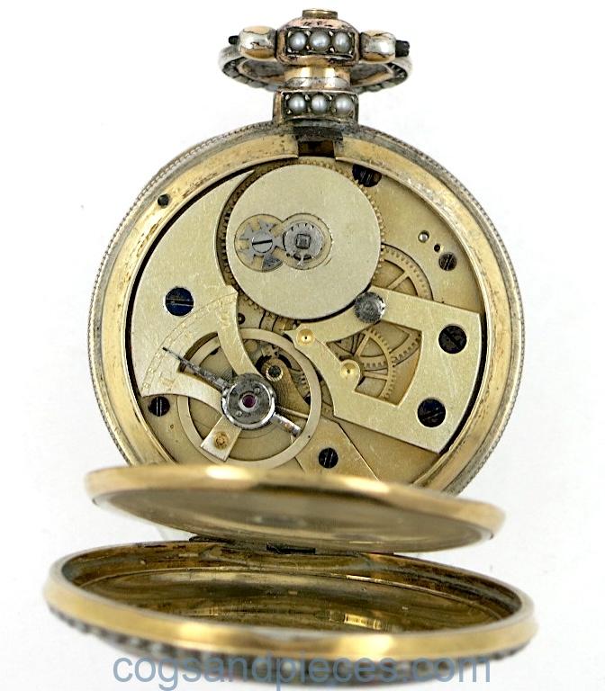 The case is in excellent condition, with just a little wear to the gilding on the bow and stem where the silver shows through. The hinges are fine and the back cover opens when the button on the stem is pressed. It also snaps shut correctly. The crystal is fine.