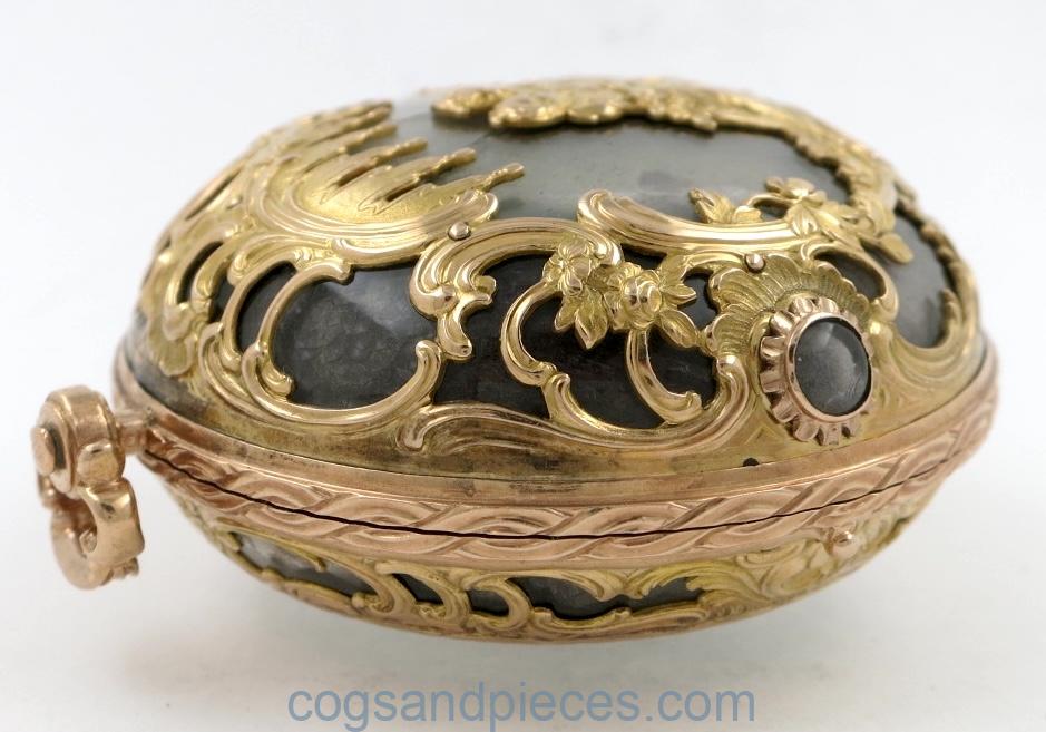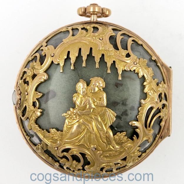 CASE : This is a wonderful and very unusual multi coloured gold case with gold repousse work over a polished moss agate base. The pierced gold bezel and borders of the back are decorated with flowers and scrolls. The centre of the back shows two figures under drapery hangings.