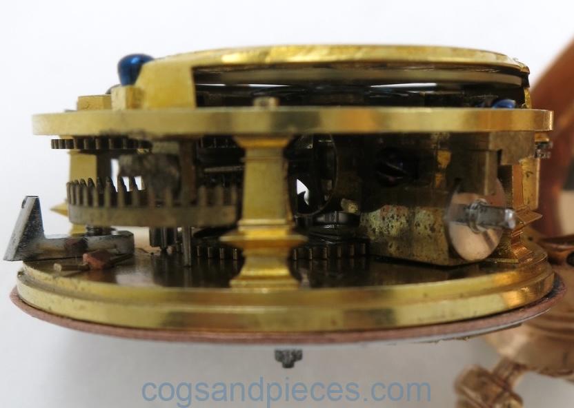 MOVEMENT : A fine quality gilded movement with verge escapement. The large balance bridge is finely pierced and engraved. Four square pillars and large silver regulator disk.