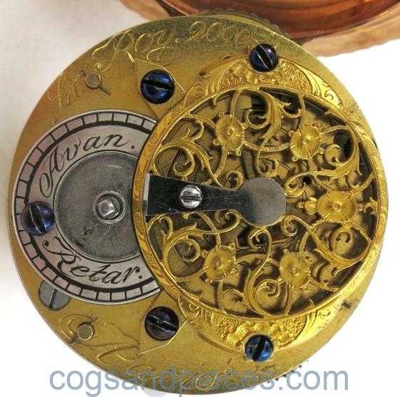 An exquisite and excellent quality gold verge pocket watch, with matching gold chatelaine. Finely decorated with rose gold repousse work overlaying moss agates.
