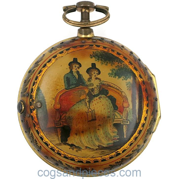 OUTER CASE : A wonderful gilt brass pair case with underpainted horn covering. The bezel and back are both decorated with a seaweed pattern, with the back showing a couple in 18thc. dress. Beautifully painted, with gold highlights.