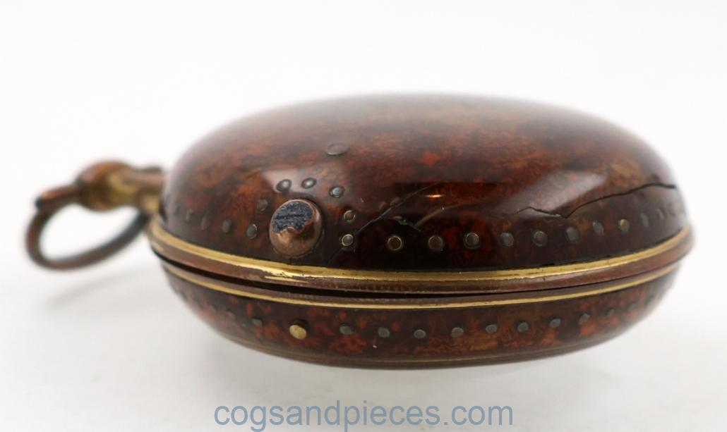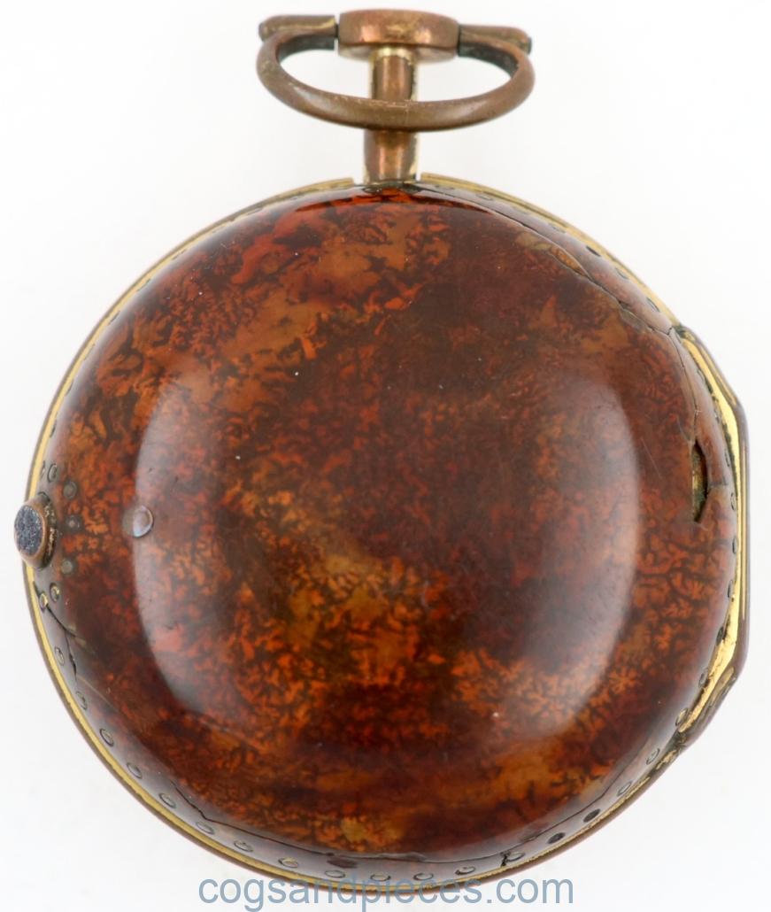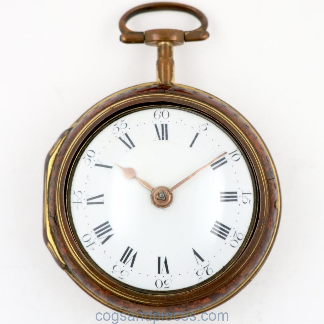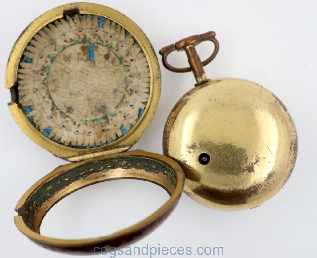 OUTER CASE : Gilt brass pair case with underpainted horn covering. The bezel and back are both decorated as tortoiseshell.