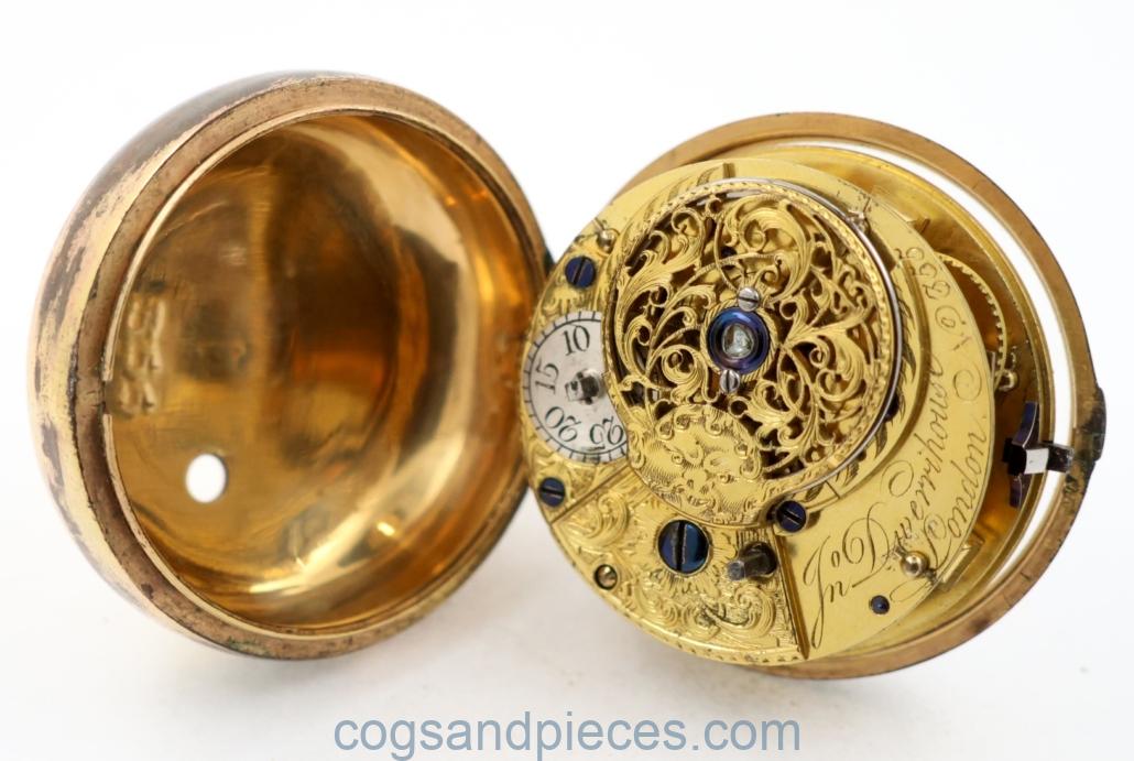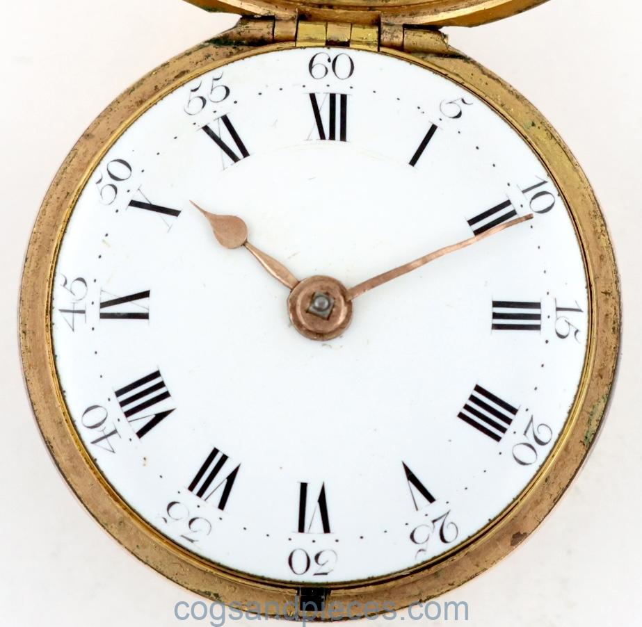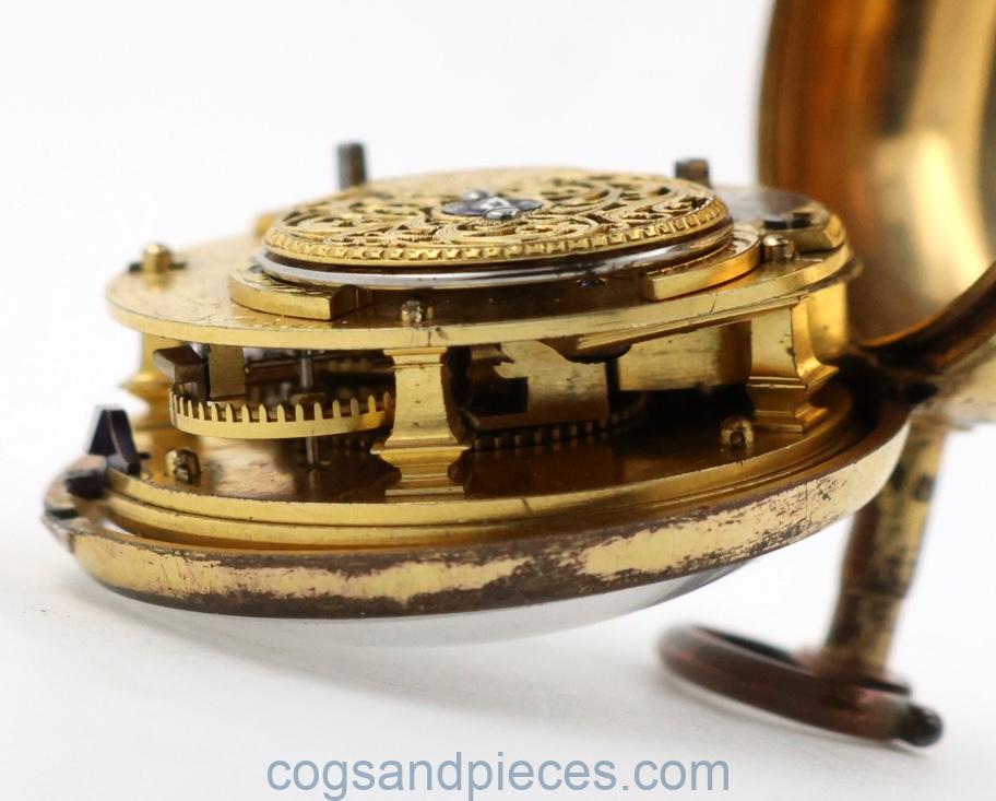 MOVEMENT : A fine quality gilt verge movement, with a well engraved and pierced balance cock, with a mask to the neck and diamond endstone. Four square pillars, silver regulator disk and blued steel screws.