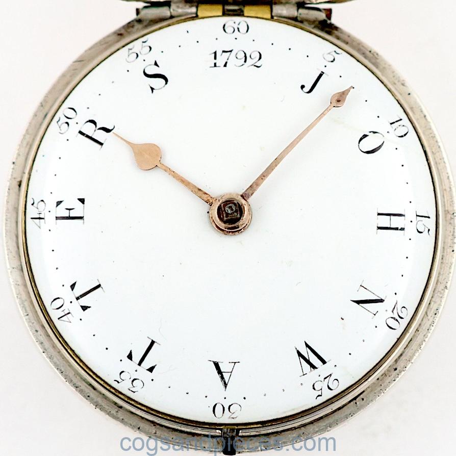 DIAL : The very unusual white enamel dial has the owner’s name JOHN WATTERS instead of numerals, but very unusually also has the date 1792 instead of the 12 hour.