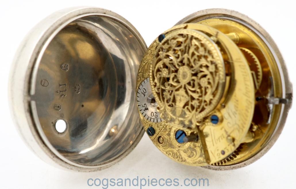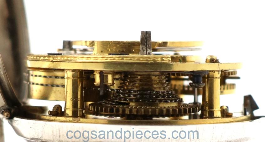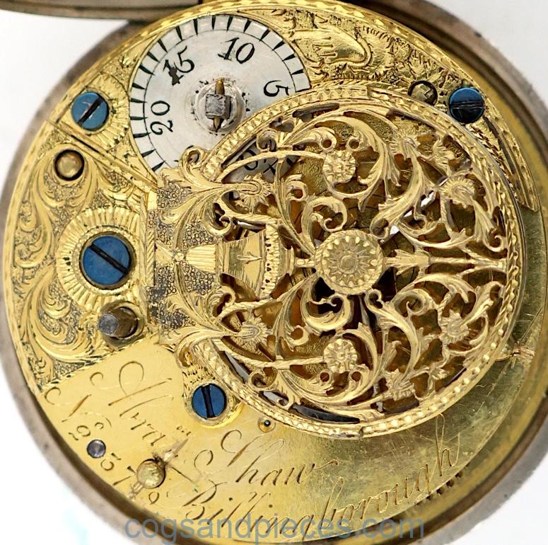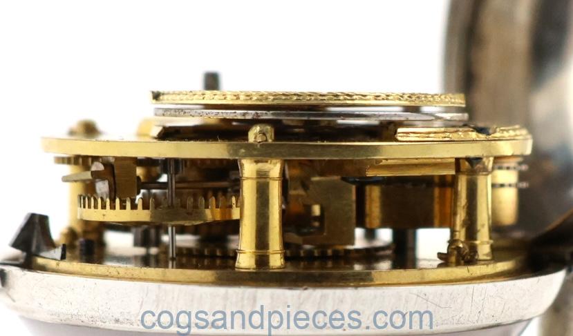 MOVEMENT : The gilt fusee movement has a verge escapement, finely engraved and pierced balance cock with vase to the neck, four round pillars, blued steel screws and a Tompion type regulator.