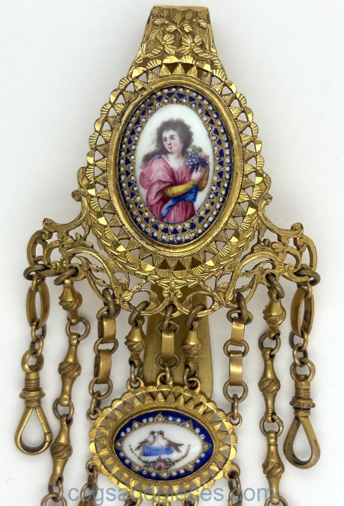 The openwork bright-cut clip and the two suspended elements, are each inset with enamel plaques. The top one is painted with a woman emblematic of autumn, the others with billing doves and a dove and bow.