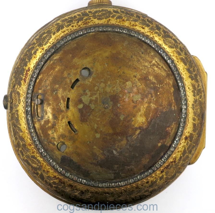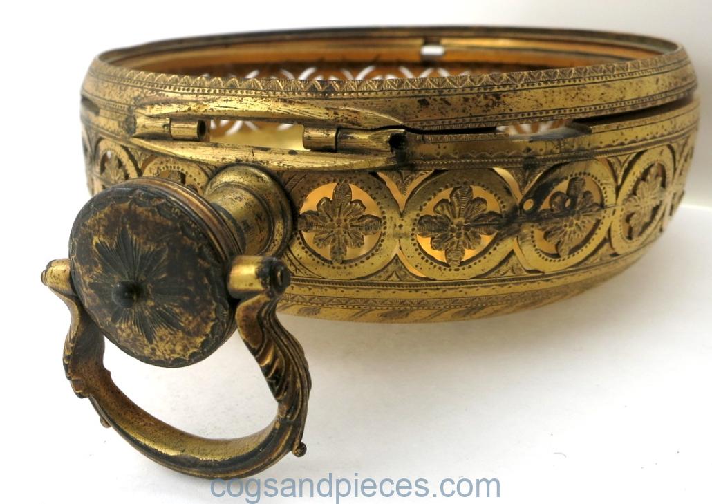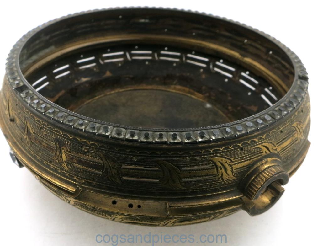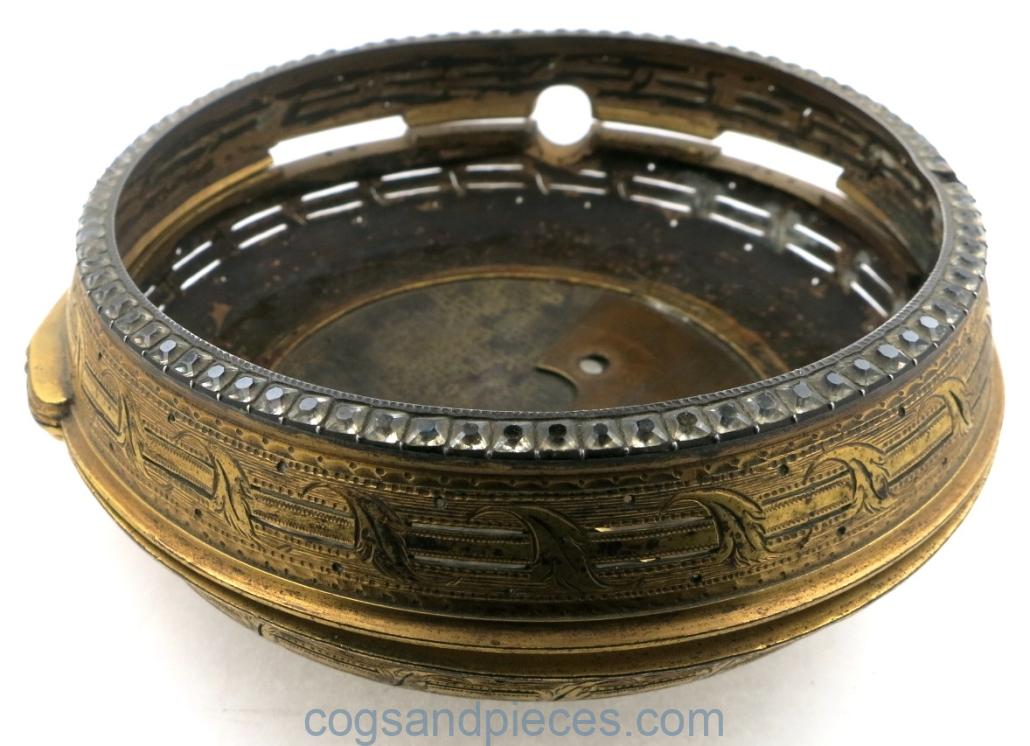 Good condition throughout. The hinge is fine, though missing the pin. No crystal. Very little wear to the gilding, mostly to the stem and bow.