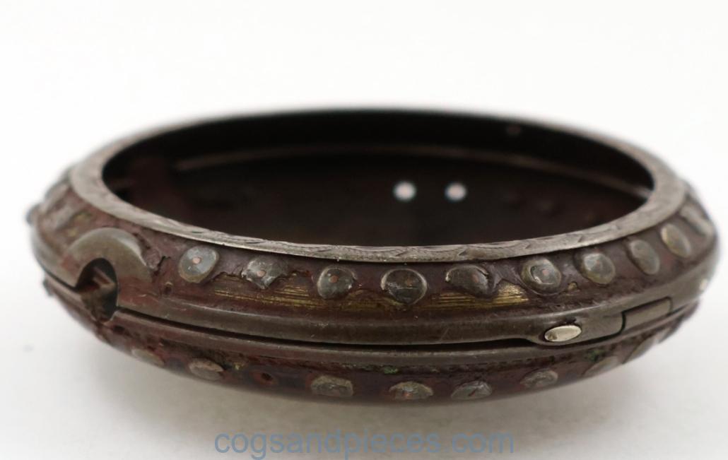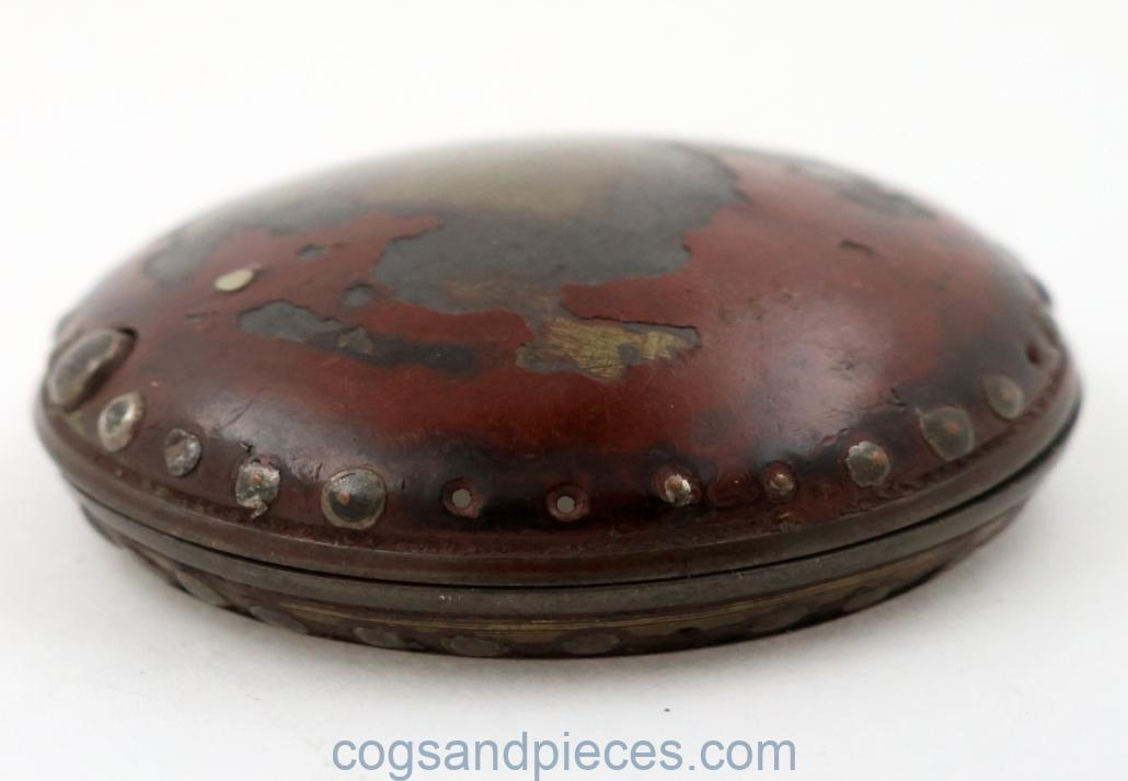 The lacquer has badly worn. Eight pique work pins are missing, but the underlying metal case is ok. The hinge is good and the catch and catch button are present. The bezel snaps shut..